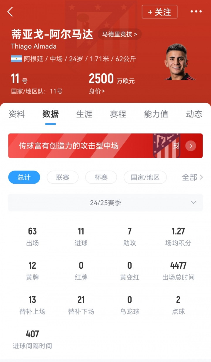 格里兹曼现年34岁,很快需要替补。阿尔瓦雷斯将承担大部分创造力,但阿尔马达上赛季在法甲每90分钟创造2.1次机会表明他能成为高水平贡献者。关键在于,他无球时也很努力,上赛季在对方前场每90分钟1.2次成功抢断。