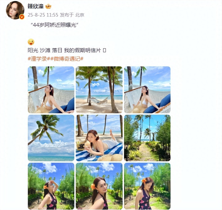 8月25日,演员阿娇(钟欣潼)在个人社交平台分享了一组旅行美照,她还俏皮发文:“44岁阿娇近照曝光”。不得不说,阿娇真是太可爱了,哈哈哈。