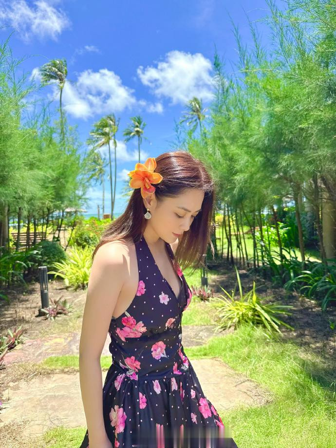 阿娇换了一条碎花挂脖裙靓丽出镜,为了搭配裙子,她戴了一朵花在发间,完美诠释了“人比花娇”啊!