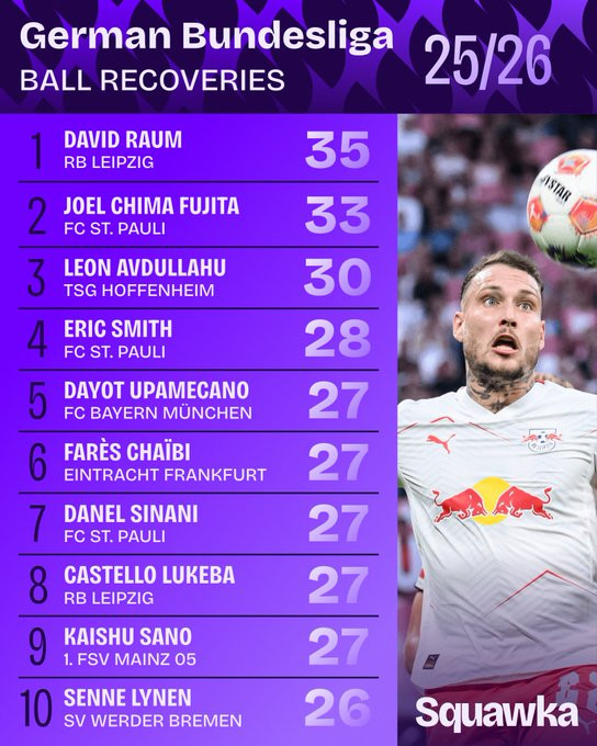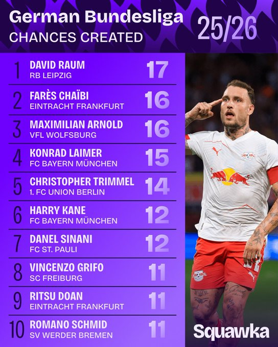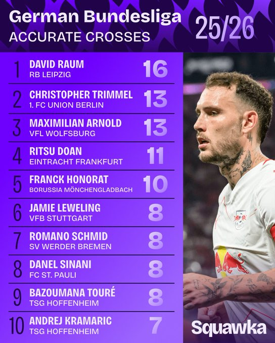 Squawka: 莱比锡后卫劳姆本赛季德甲创造机会等数据均为第一