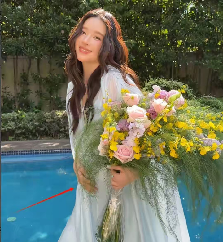 由于怀孕的原因,阚清子肉眼可见的变胖了,挺着个孕肚,行动都变慢了。她身穿一件淡黄色的新中式刺绣薄纱套裙,脚踩了一双黑色平底凉鞋,估计是为了自己的安全吧。