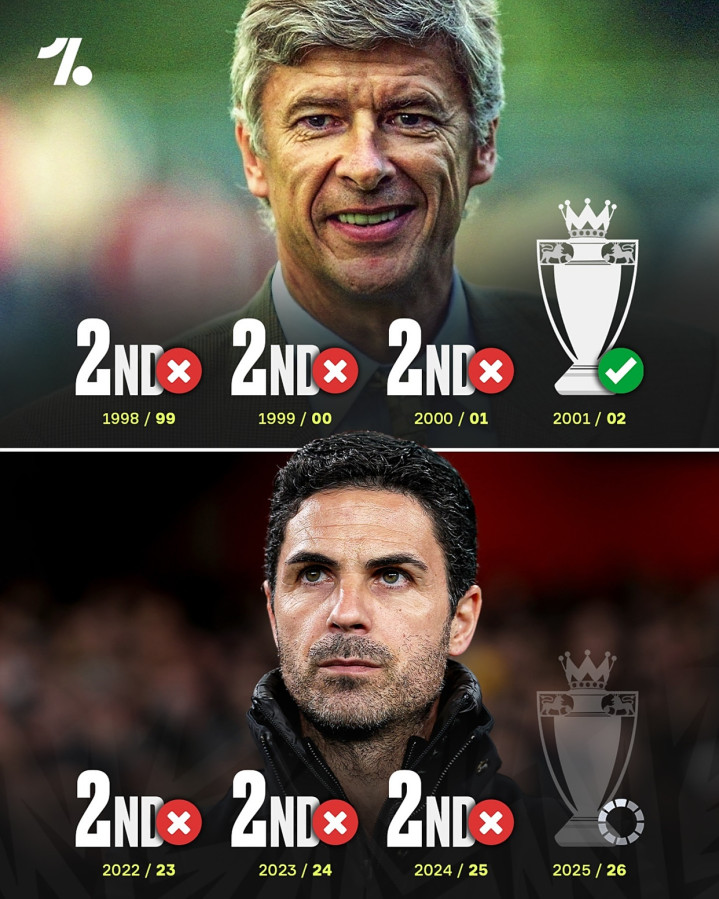 阿尔特塔在阿森纳执教期间,拿到的唯一奖杯就是2020年拿到的足总杯。自那以后,阿尔特塔带领球队重返欧冠联赛,并且在英超联赛连续三年获得亚军。阿森纳上一次拿到英超联赛冠军,已经是21年前的事情。
