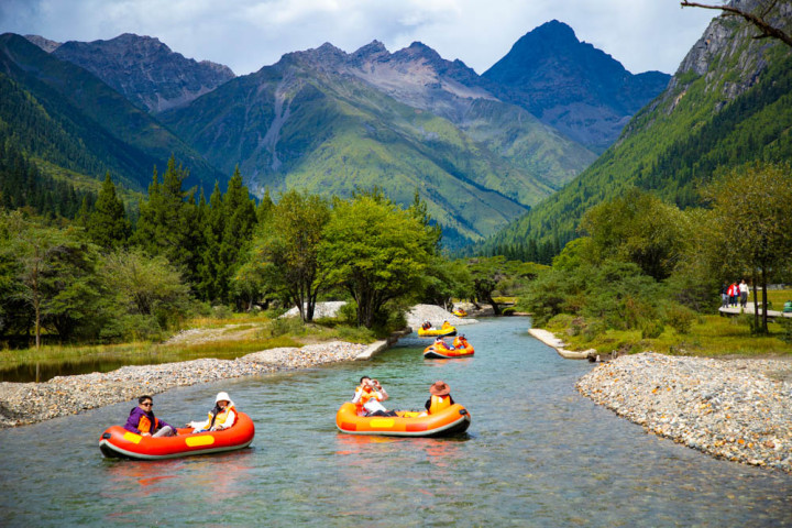 ↑2025年9月13日,在四川省阿坝藏族羌族自治州小金县四姑娘山景区,游客乘坐皮划艇观光游览。CICPHOTO/文瑞 摄