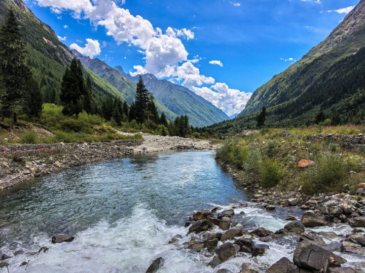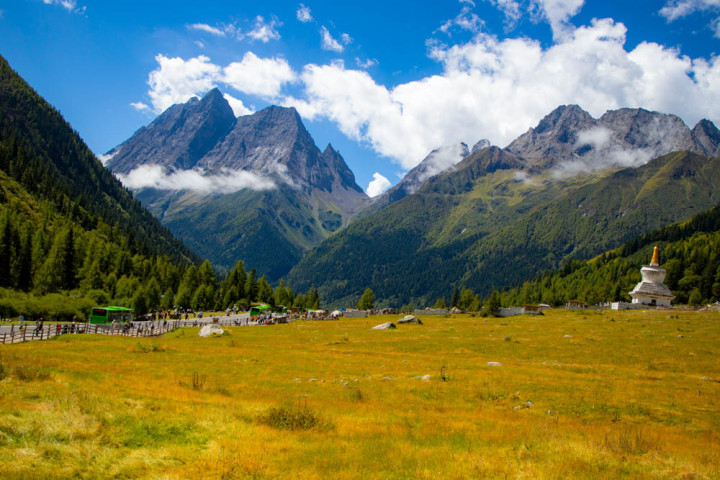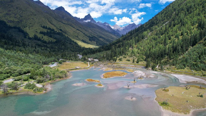 金秋时节,四川省阿坝藏族羌族自治州小金县四姑娘山景区风光旖旎,溪水潺潺,蓝天、白云与山峦共同构成一幅幅美丽的画卷。