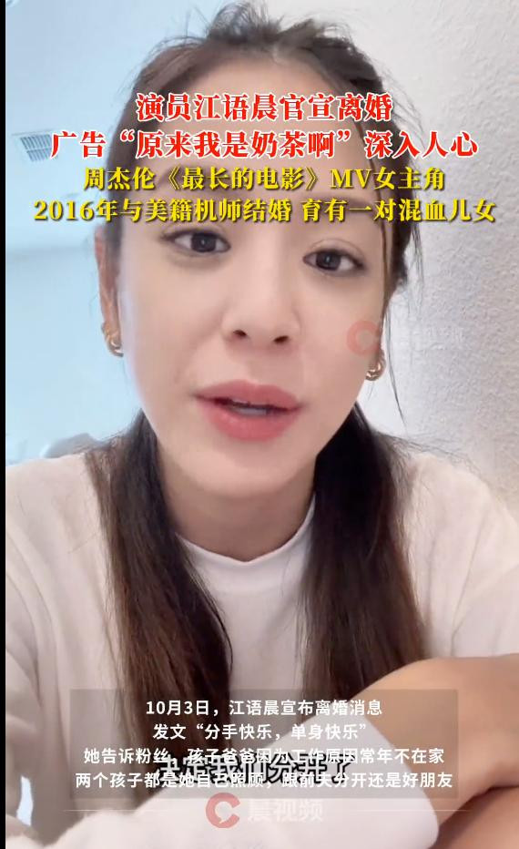 10月3日,网友透露江语晨通过小红书宣布离婚消息,发文“分手快乐,单身快乐”。她告诉粉丝,孩子爸爸因为工作原因常年不在家,两个孩子都是她自己照顾,跟前夫分开还是好朋友。